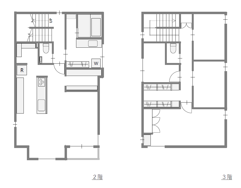 リビングには“大きな隣接収納”を設け、日々の出し入れを最短化。この収納のおかげで、リビングはいつもスッキリとした状態を保てます。また、キッチンはダイニングと横並びに配置し、パントリーの位置を見直すことで、配膳・片付け・補充が一直線に行える動線に整えました。洗面・ランドリー・脱衣はひと続きの空間にしながら、視線と動きを計算した配置を採用。扉を増やさずに済むため、コストダウンにもつながっています。さらに、収納用品に合わせて造作したランドリーカウンターで、毎日の家事が“出しっぱなしにならない”流れを実現しました。お子様の成長後を見据えた個室配置も取り入れ、長く心地よく整う住まいを目指した計画です。